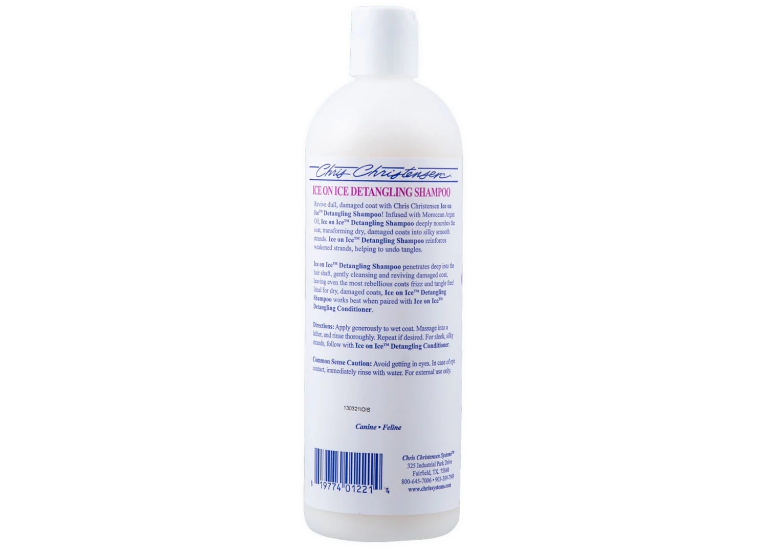 Keep your pet’s coat glossy and tangle-free with Chris Christensen Systems Ice on Ice Detangling Shampoo. This luxurious shampoo is infused with Moroccan Argan Oil to nourish dull, damaged coats. Deeply penetrating the hair shaft, this shampoo works to revive even dry, damaged coats and turn them into a sleek, smooth mane.