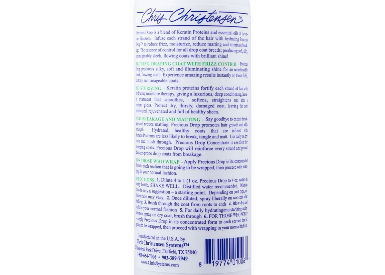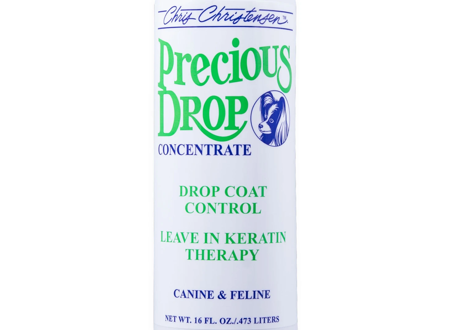 Precious Drop is a blend of Keratin Proteins and essential oils of Lavender Blossom. Infuse each strand of the hair with hydrating Precious Drop™ to reduce frizz, moisturize, reduce matting and eliminate breakage. The essence of control for all silky, unimaginably sleek, flowing coats with brilliant shine!drop coat breeds; producing soft, silky, unimaginably sleek, flowing coats with brilliant shine!