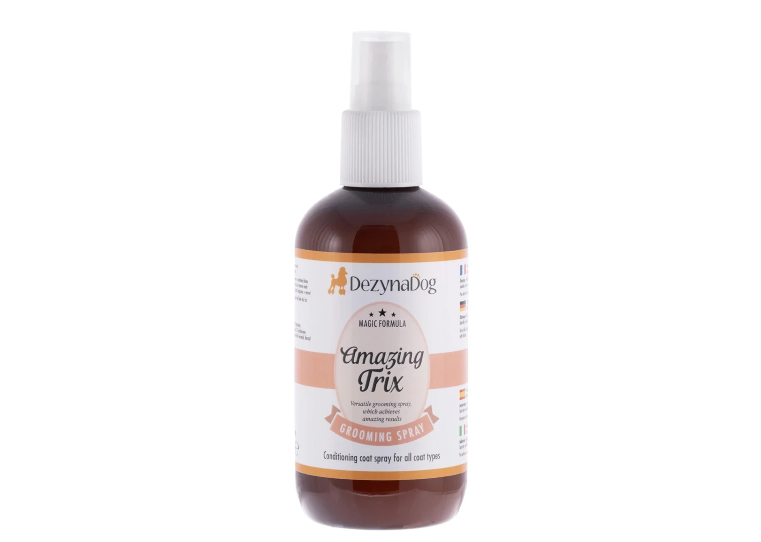 Magic Formula AmaZing Trix is a professional-grade grooming spray that conditions the coat, prevents tangles and mats, and enhances body and lustre. This amazing formula aids in de-matting and de-tangling, making grooming easier than ever before. It also helps to preserve the coat and reduce static, for a high-quality finish every time. Use Magic Formula AmaZing Trix regularly to keep your dog looking their best.
