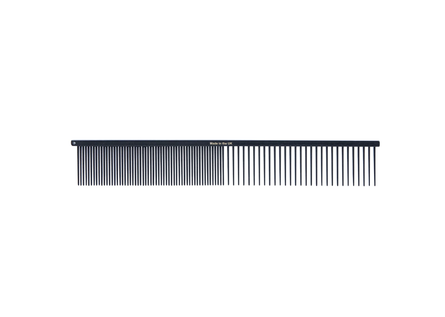 This Gun Metal comb is 25cm long with 50/50 tooth spacing and 32mm teeth, making it easy to groom larger, thicker coats. Whether it’s bodywork or a gentle comb of the feet or face, this comb is great for all tasks.