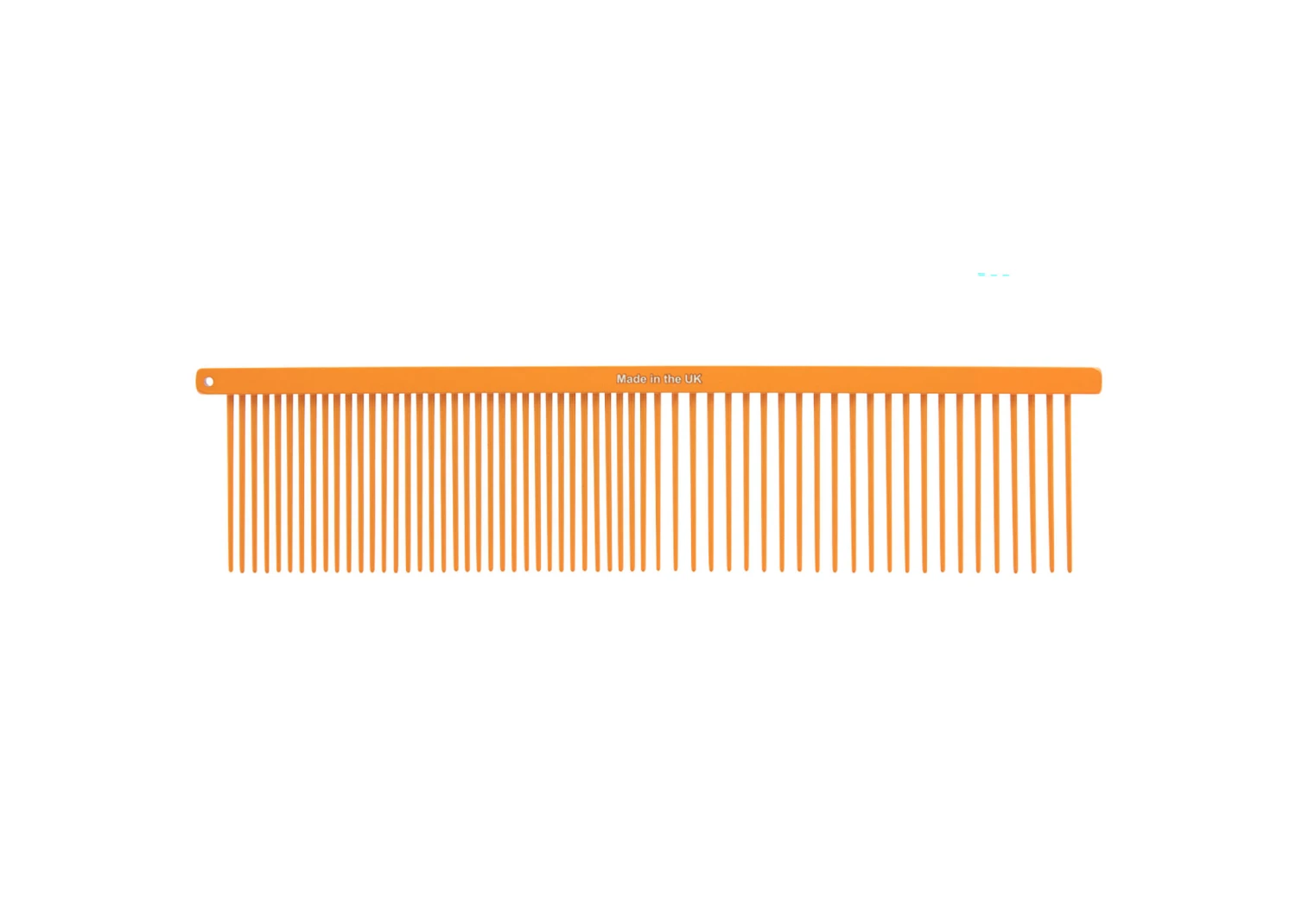 Dezynadog’s Ember Orange 50/50 19cm comb long teeth is the perfect tool for creating lift and volume in your dog’s coat. The teeth are spaced 50/50 and are made of a strong, yet lightweight material that glides through the coat effortlessly. These combs are also available in a variety of sizes and styles to suit your specific grooming needs. Made in the U.K.