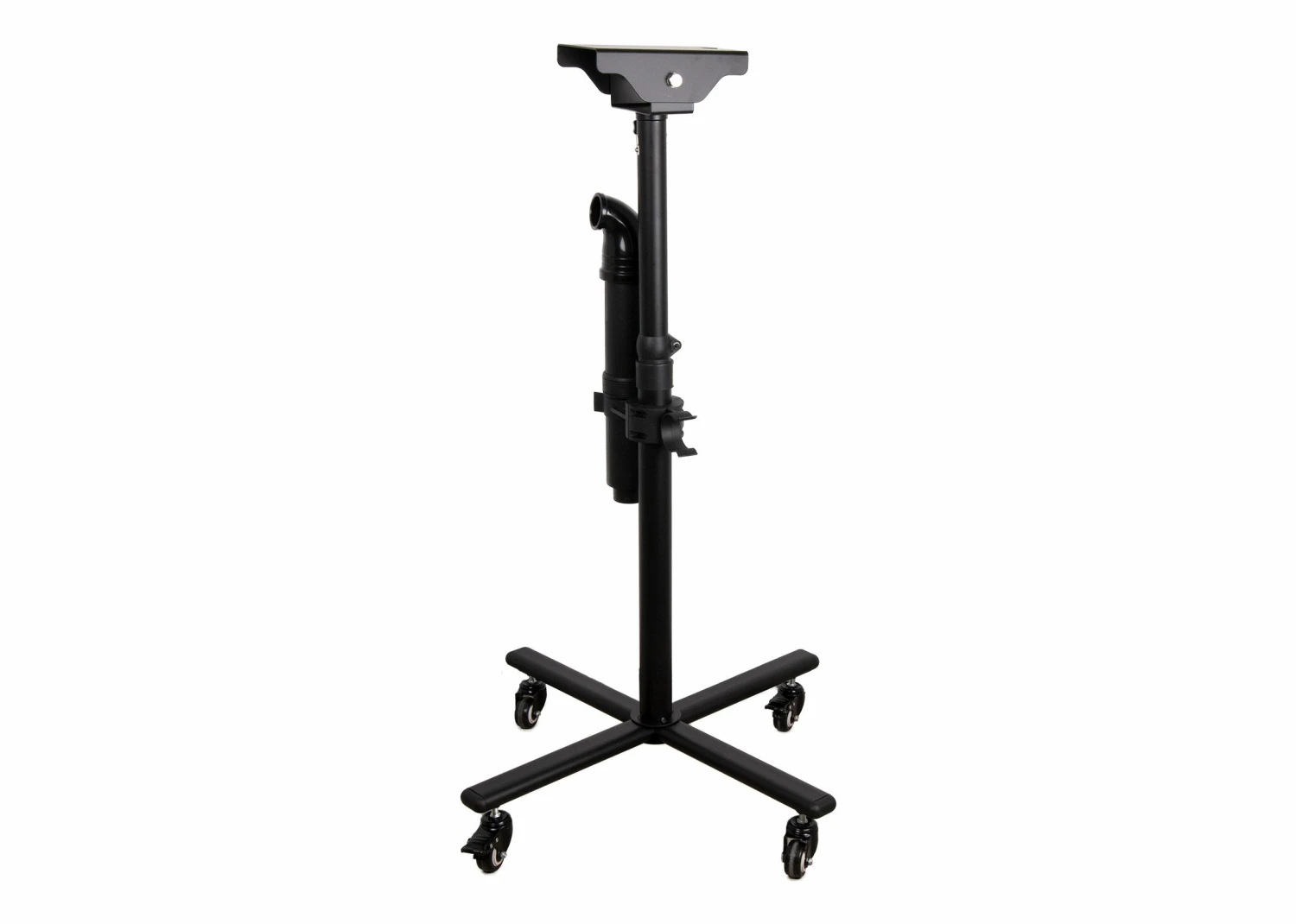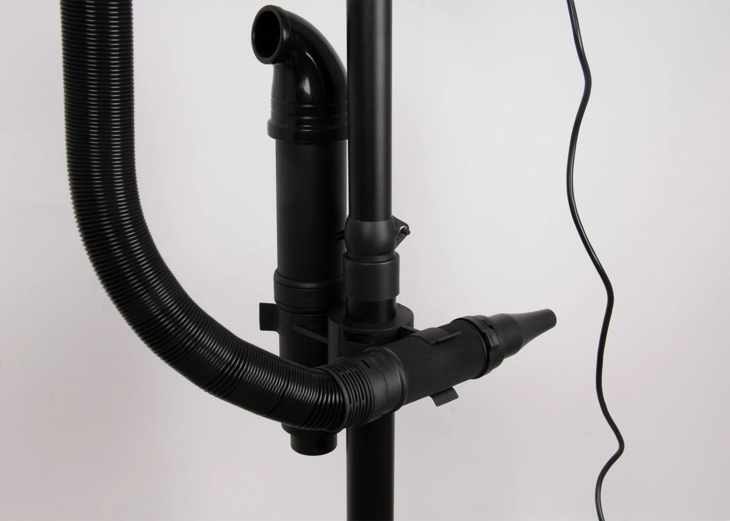 The adjustable height stand, complete with storage system for hose and pipe, features locking wheels and is presented in a smart and practical satin black finish.