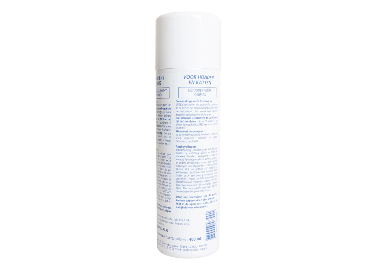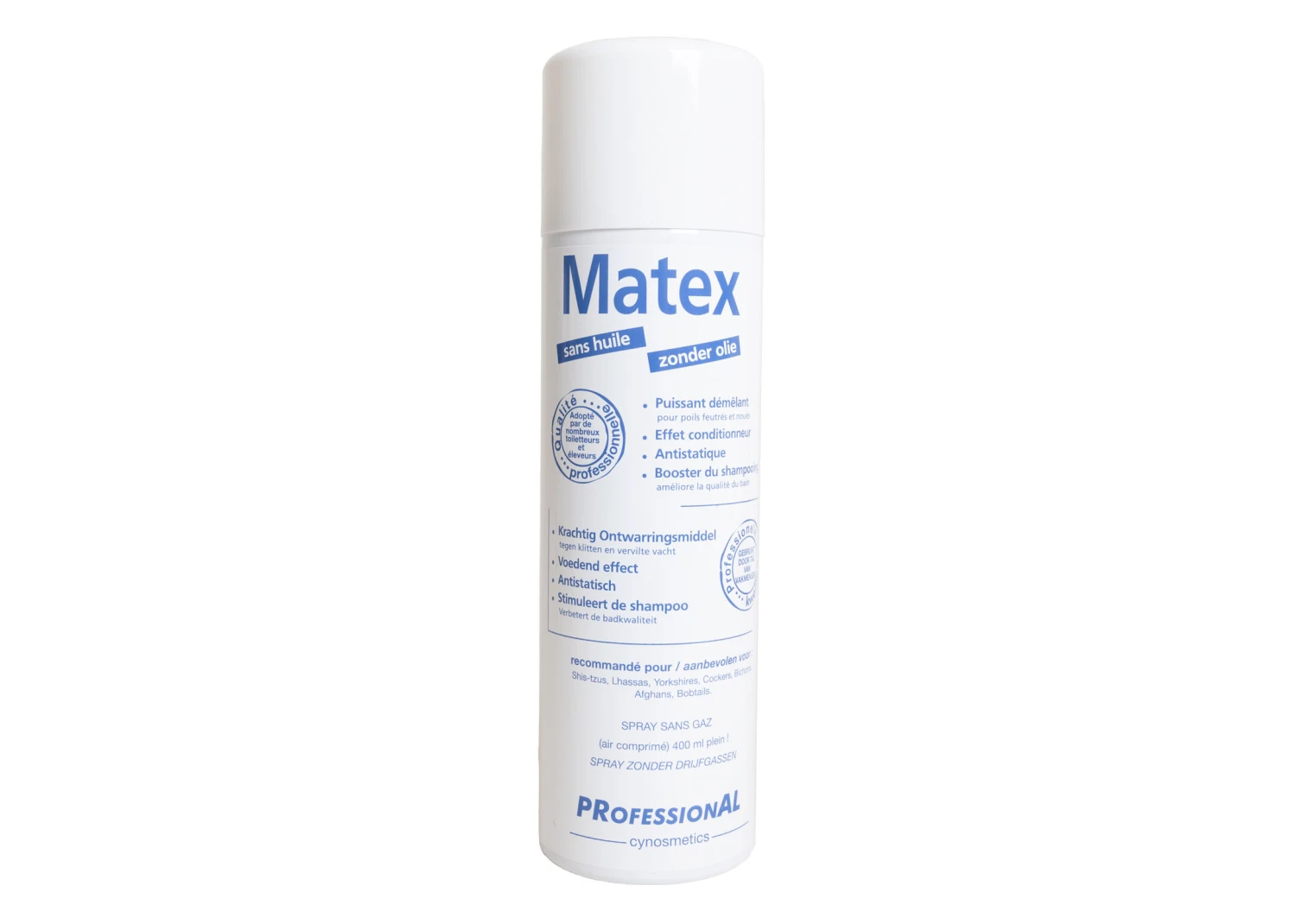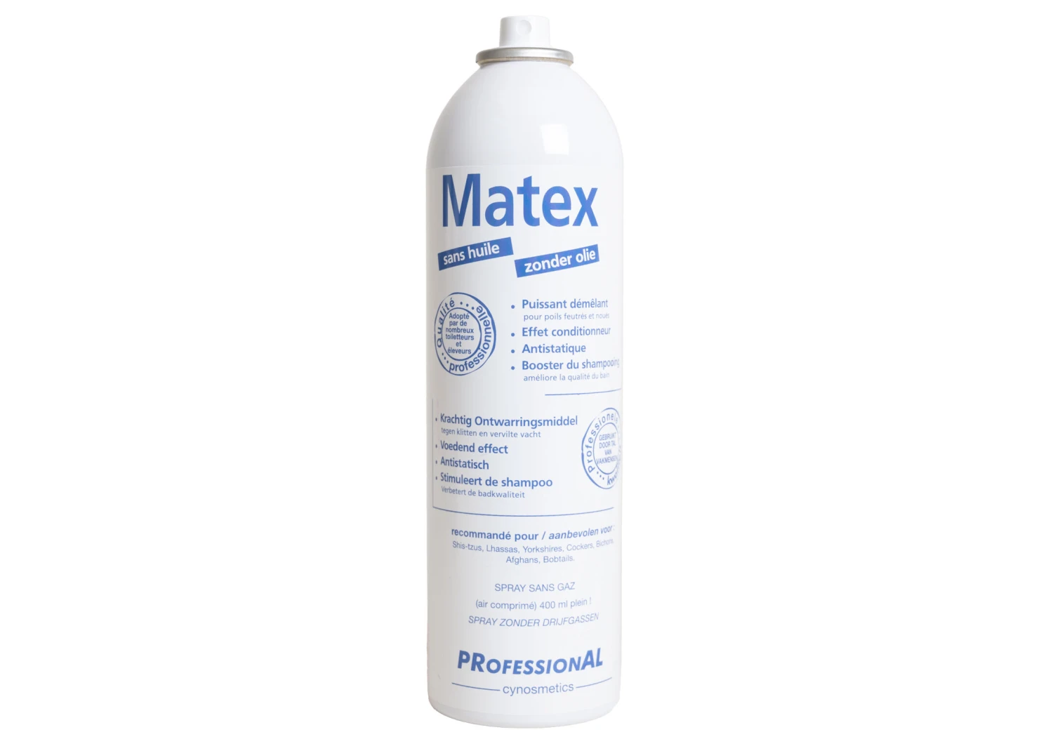 This unique product helps remove and prevent mats. Works like a conditioner to repair and nourish the coat. The moisturizing effect of Matex considerably reduces the chance of new mats forming, while strengthening and protecting the coat from drying out. Works equally well on dry or wet hair and can be used during bathing as a booster for the shampoo. Leaves the coat soft and shiny with a fresh fragrance. The anti-static properties of Matex make it ideal for all longhaired dogs and cats.
