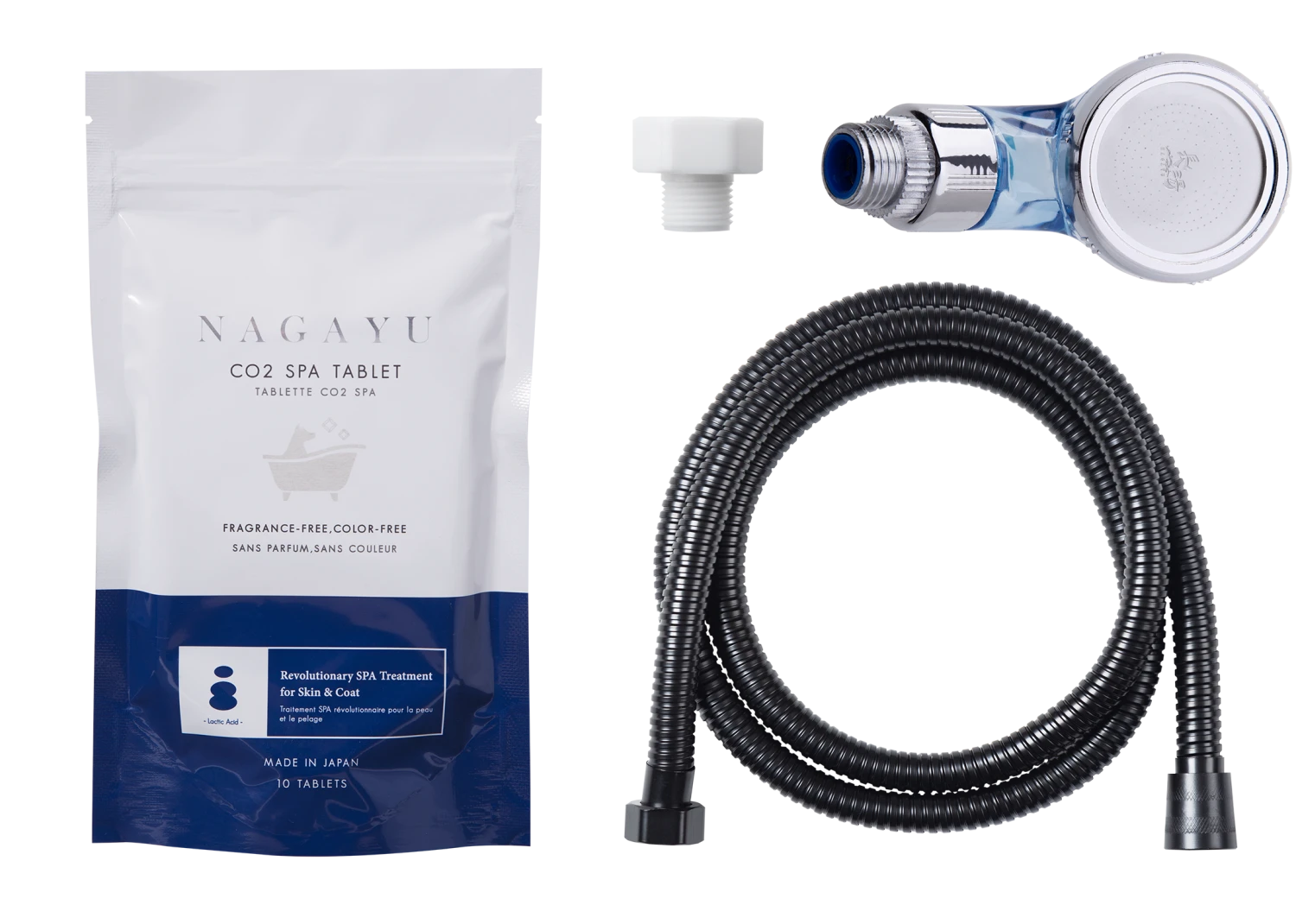 Nagayu starter kit contains professional shower head with special tablet compartment, Flexible stainless steel hose with ½ inch – ¾ inch (1,27cm – 1,9cm) adaptor, Pack of 10 Nagayo CO2 Spa tablets.
