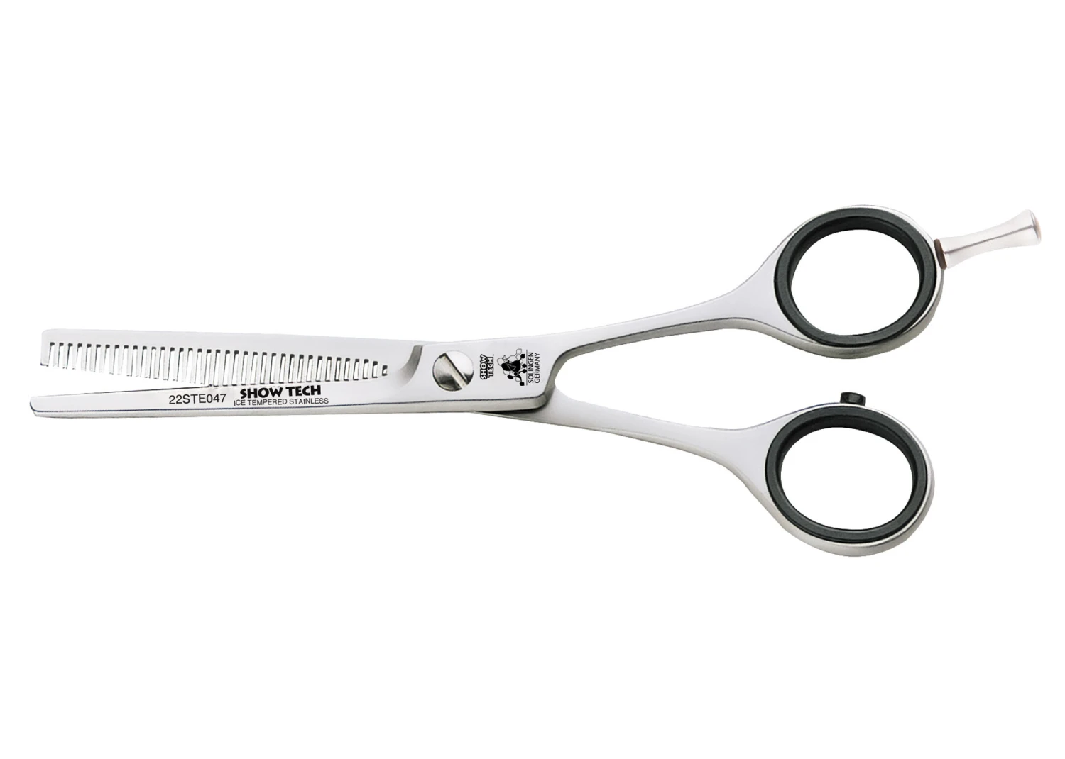 Show Tech Scissors are designed and produced specifically for dog groomers. Hand made in Solingen, Germany, each scissor is meticulously hand crafted in a 150 step manufacturing process. All models are forged from nickel-free stainless steel and ice tempered to ensure maximum hardness, this permits the creation of an ulta sharp cutting edge. The micro serrations on the blades guarantee an accurate and perfectly smooth cut which lasts. Show Tech Scissors are high quality professional tools at incredible value for money prices.