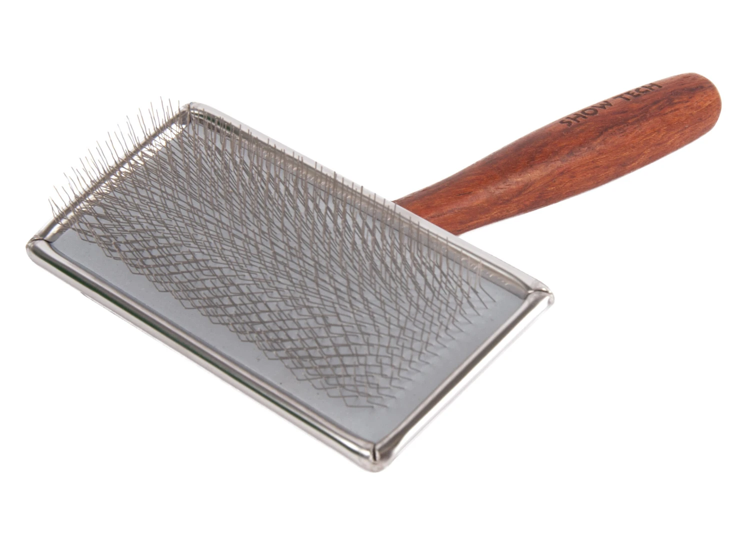 A quality product exclusive to Show Tech! These fine slicker brushes are suitable for all breeds, even the most fragile coats, brushing thoroughly yet softly to remove tangles and straighten the hair. The supple pad allows the pins to flex with the hair, minimising damage and breakage in the coat. Ideal to use while drying the coat due to the fine pin spacing. Available in 4 sizes. New, improved rosewood handle!