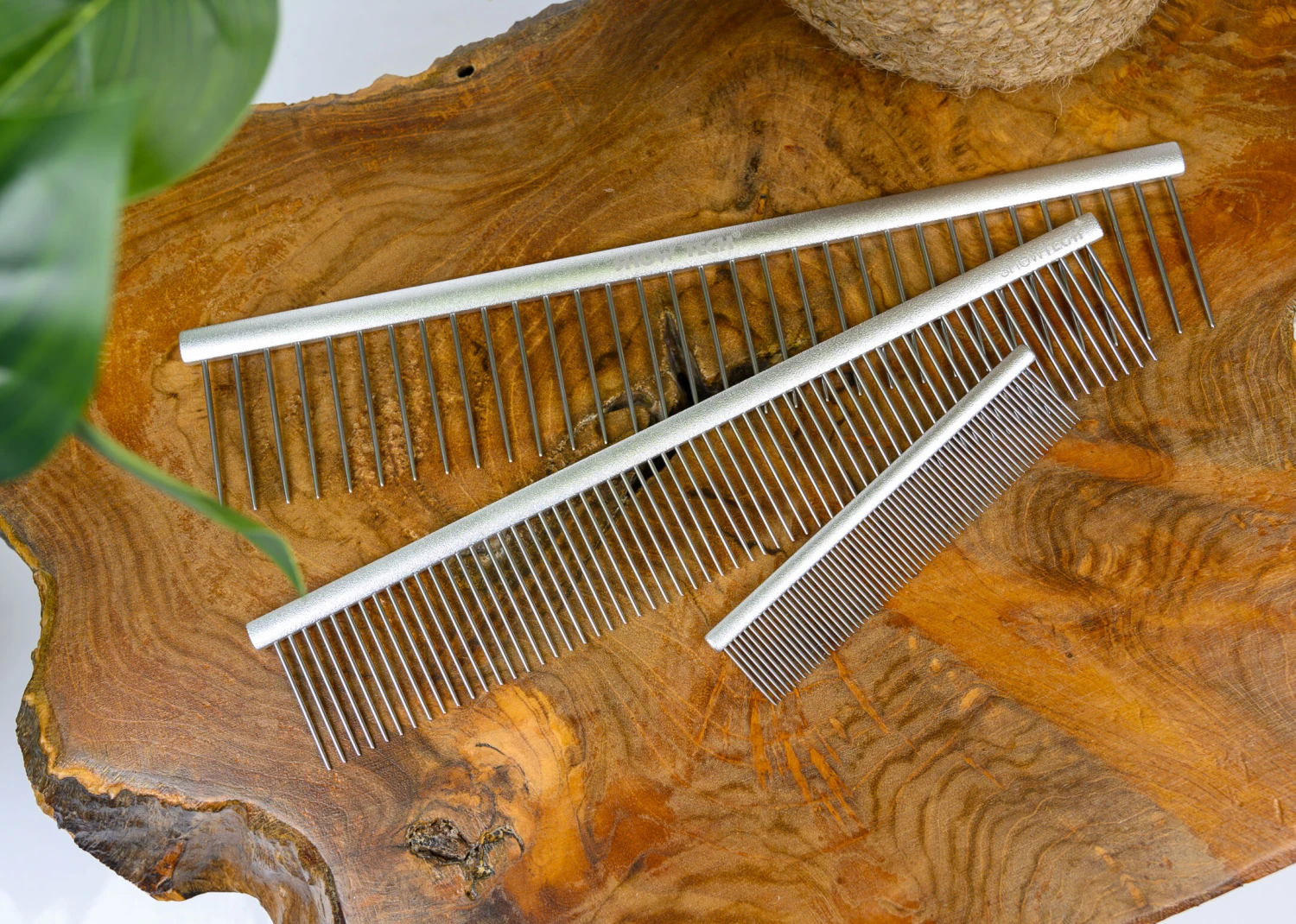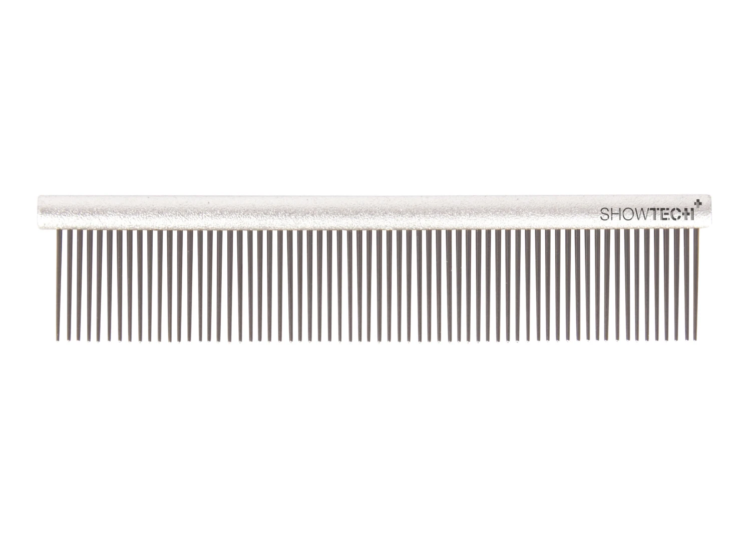 The Show Tech + Featherlight combs are the ultimate in professional combs for styling and fluffing. Made from aluminium with polished stainless steel teeth these combs are the finest and lightest available. Each tooth is perfectly formed with the tip rounded to prevent damage to coat and skin. Available in 3 sizes: 11,5 cm long with 19 mm pins, 25 cm long with 36 mm pins or 28 cm long with 42 mm pins.