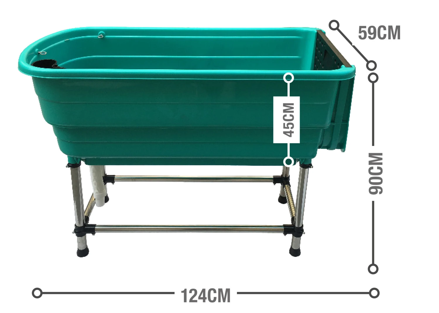 In the Handy tub, your best friend will feel comfortable thanks to the flat, anti-slip floor. The super handy built-in bottle holder ensures that chasing the shampoo bottle around the bath is a thing of the past! Bending over and sitting on your knees until they hurt while washing? No way! The Handy Tub allows bathing at a comfortable and ergonomic height, thus making the whole experience much more relaxing for both you and your beloved pet. Thanks to the 3 stainless steel bath rings, you can attach a leash to stop the dog from jumping out. The sturdy, tubular frame is very stable and can be easily and quickly assembled with the provided tool. Perfect for all breeds (up to 75 kg). For small breeds, there is a 50 x 60 cm platform with anti-slip surface to raise the bathing height. The bath comes with a flexible drain hose (max. 67 cm), a removable door and an anti-slip ramp that is recommended to help get larger breeds in and out of the bath easily.