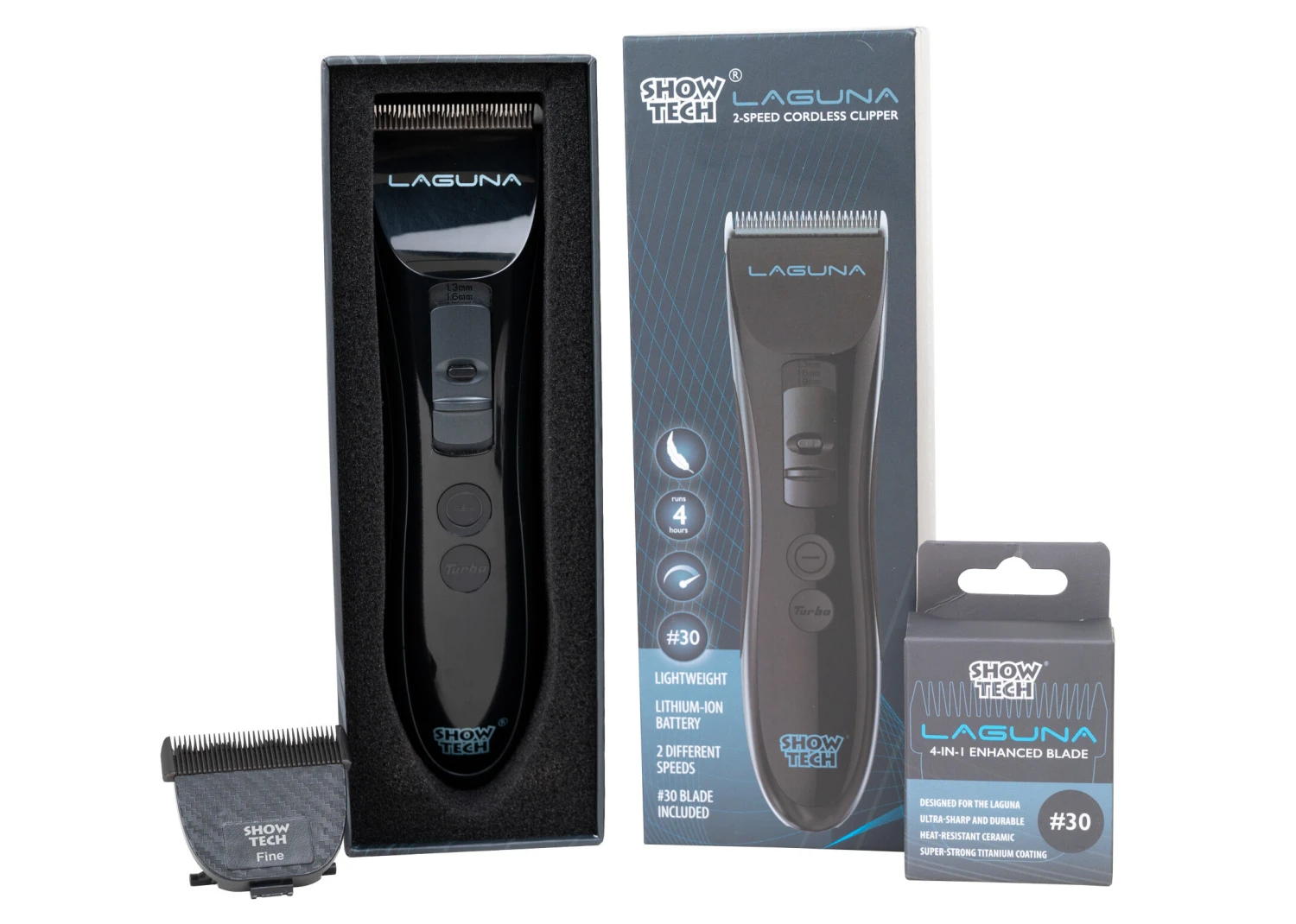 What is unique about the stylish and value-for-money LAGUNA clippers is that they are fitted with an exclusive wide range of blades. These sharp, quality Laguna blades help you quickly and easily shave all coats, including long and thick ones. This makes the Laguna suitable for both smaller and larger jobs. Â