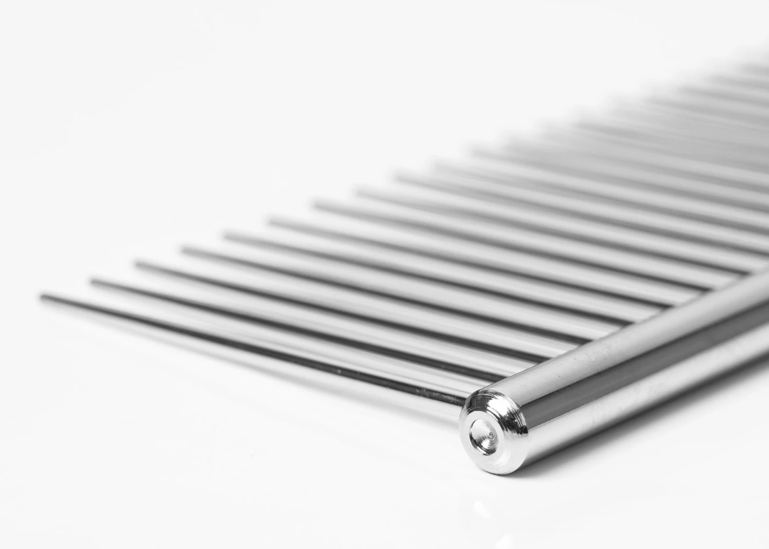 The Pro Combi Comb is a standard, yet sturdy and strong, full metal dog grooming comb, with 4,4 cm long, conical teeth which are a combination of fine and coarse. Each tooth is both strong and smooth and all the teeth are mounted perfectly straight in the brass spine. Having the ideal thickness and being conical, the non-sharp pins with rounded tip allow you to comb easily and to penetrate thick and tangled coats. Because the teeth are conical and slightly finer at the tip, it is much easier to get through and deep into any coat, even thicker ones, and close to the skin. The teeth are made of high-quality, strong and durable steel with a smooth, thick and highly chromed finish to make the comb glide easily through the coat. All this makes this combing tool a must-have! Â