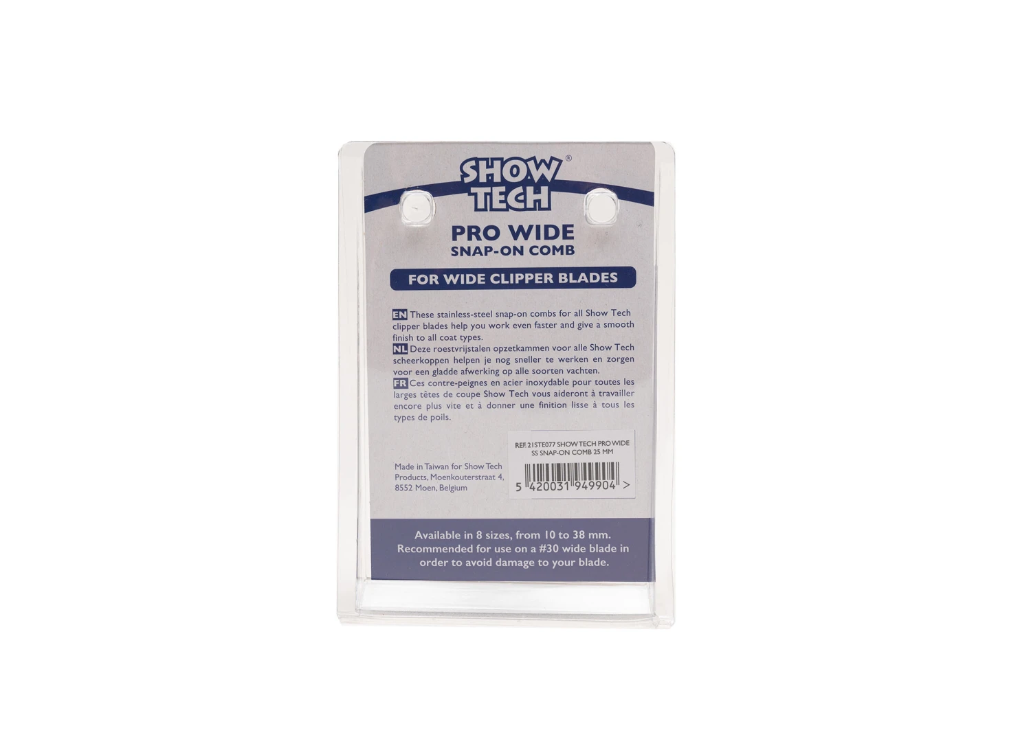 These extra wide stainless-steel snap-on combs for the Show Tech wide clipper blade #30 (and #15 and #10) help you work even faster and give a smooth finish to all coat types.