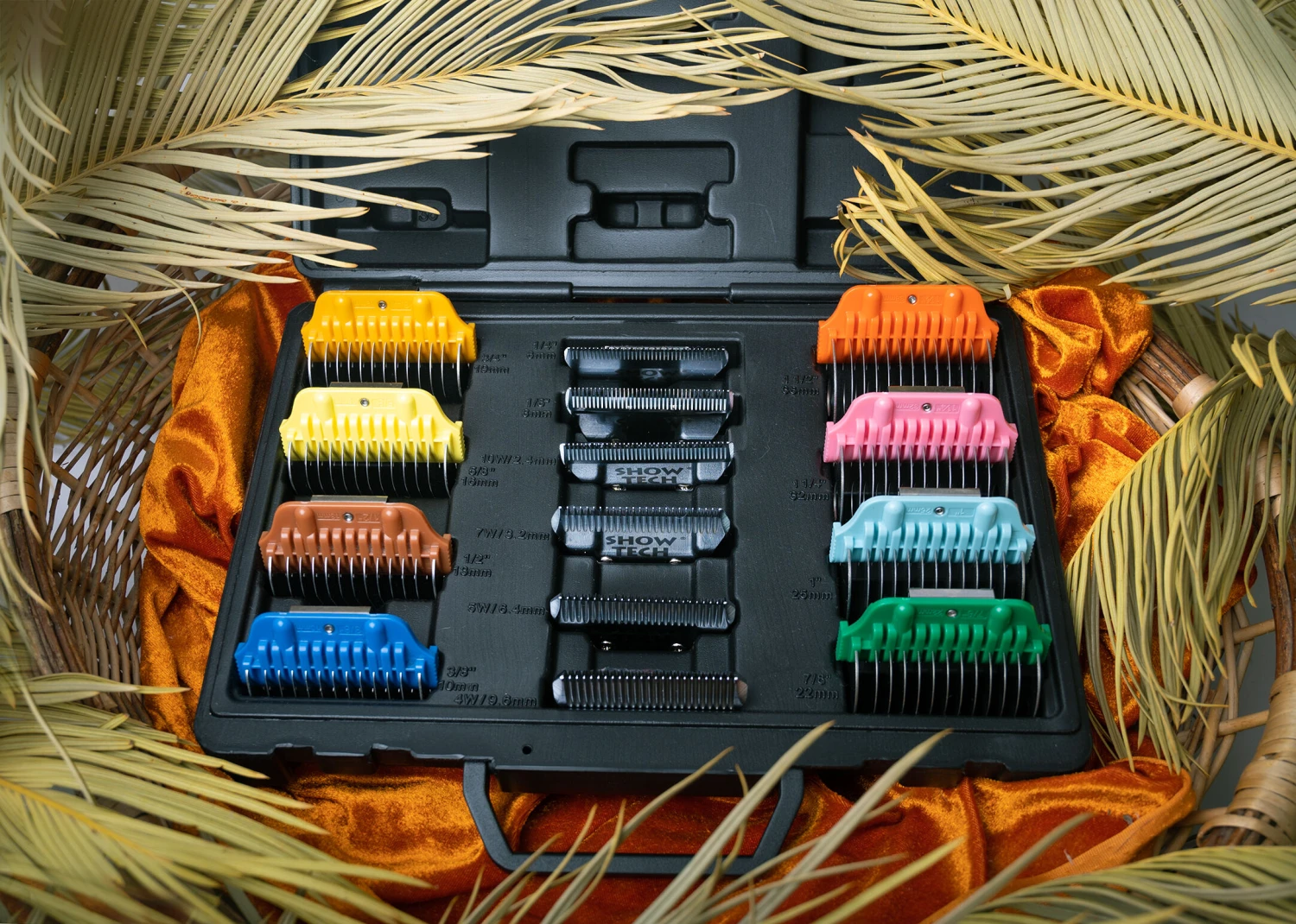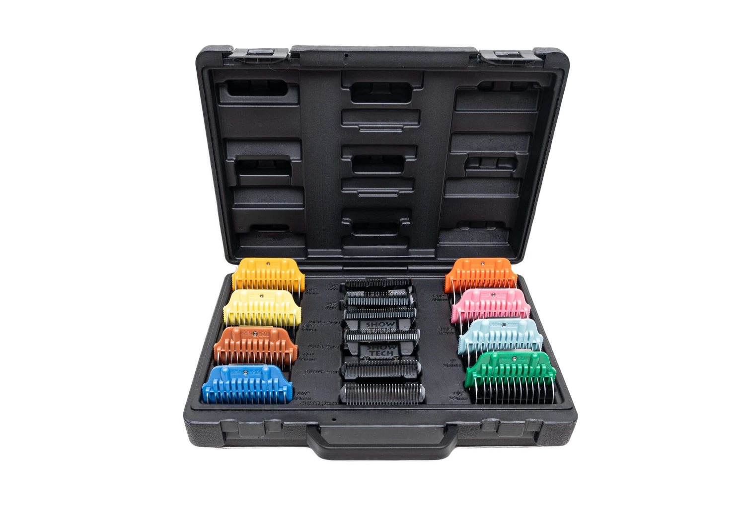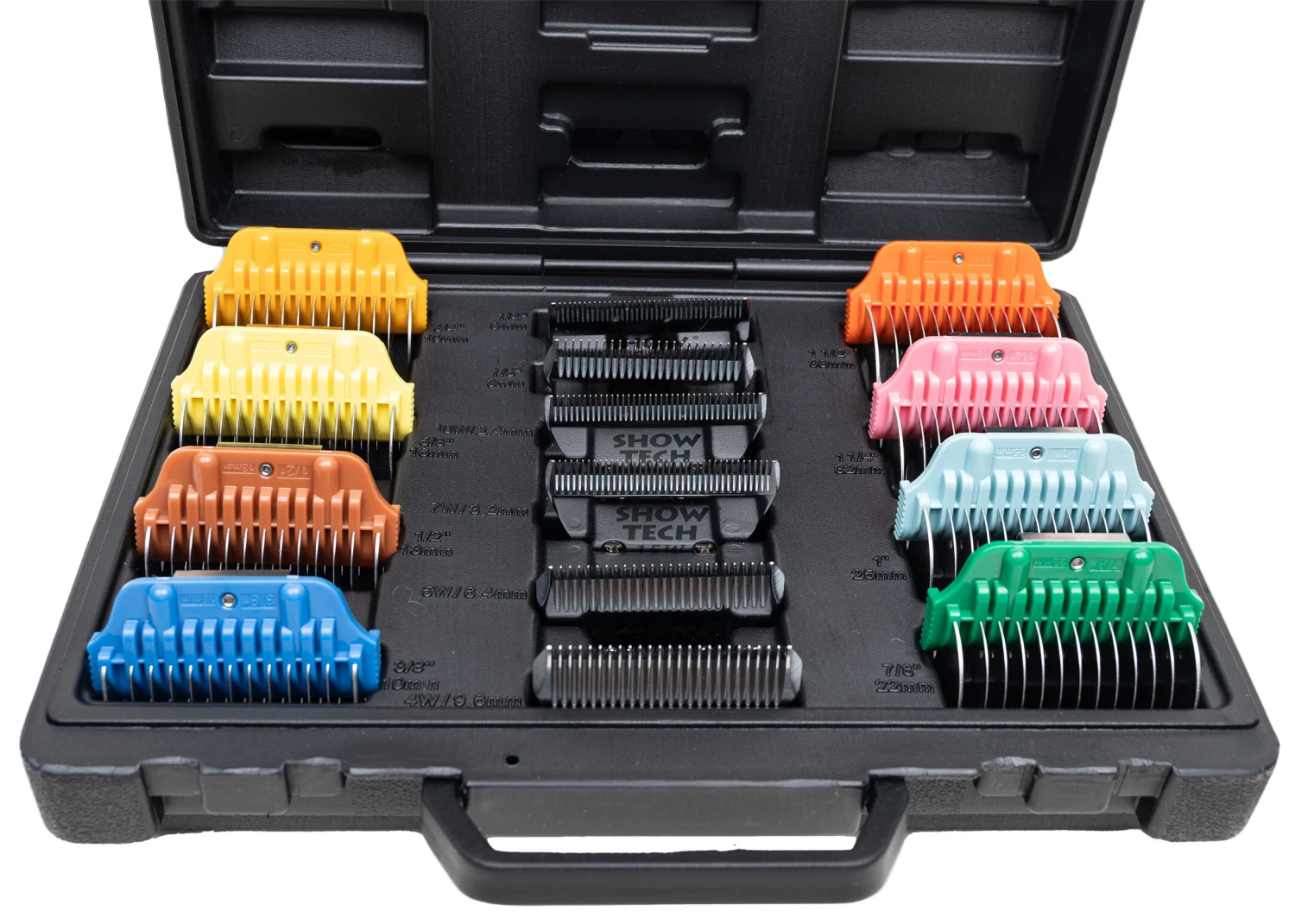 In addition to having all lengths of the Show Tech wide snap-on combs (10, 13, 16, 19, 22, 25, 32 and 38 mm) at your disposal, you also get 6 Show Tech Pro Wide snap-on clipper blades (#30, #15, #10, #7, #5 and #4). These premium “snap-on” style clipper blades are made from the finest carbon steel and finished with a highly polished chrome coating to resist rust. They are compatible with most professional animal clippers that function with snap-on blades such as Heiniger, Andis, Wahl, Oster en Aesculap Fav 5.