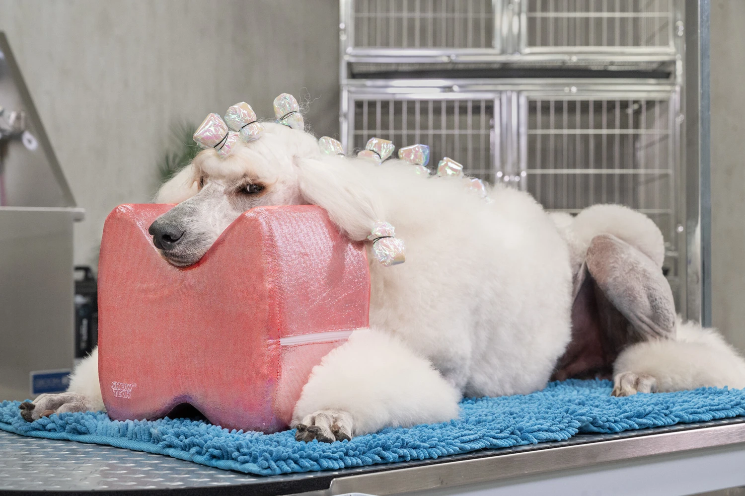- Cushion designed to support the head of long-haired (show) dogs when making topknots