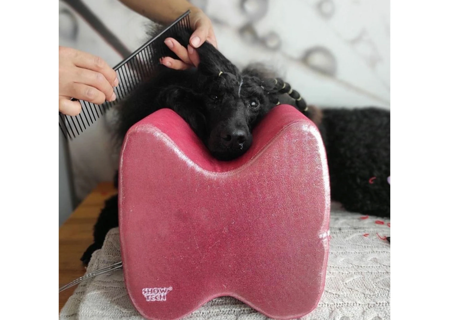 This cushion with a unique shape supports the dog’s head. While you are creating the topknot, the dog can comfortably rest its chin on the cushion with his or her head in the same position. A relaxed dog makes the grooming experience a lot more enjoyable for both of you. He or she will be in a relaxed position, and you can work comfortably on the dog.