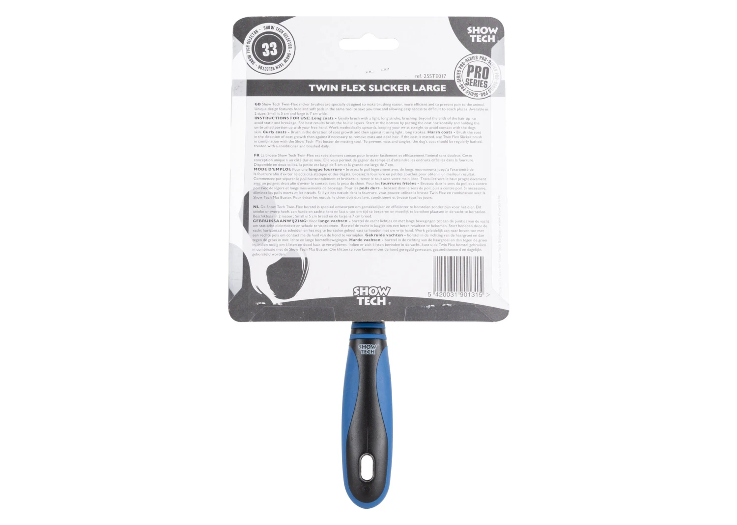 Show Tech Twin-Flex slicker brushes are specially designed to make brushing easier, more efficient and to prevent pain to the animal. Unique design features hard and soft pads in the same tool to save you time. The soft pad has long, strong pins to reach deep down into the coat. Turn the brush through 180¡ and you have a hard pad with long, firm pins to make short work of mats and difficult coats. With its ergonomic, comfortable handle and flexible head, the Twin-Flex guarantees a minimum of stress on hand and wrist while maximizing efficient mat removal…Every groomer should have one! Available in 2 sizes.