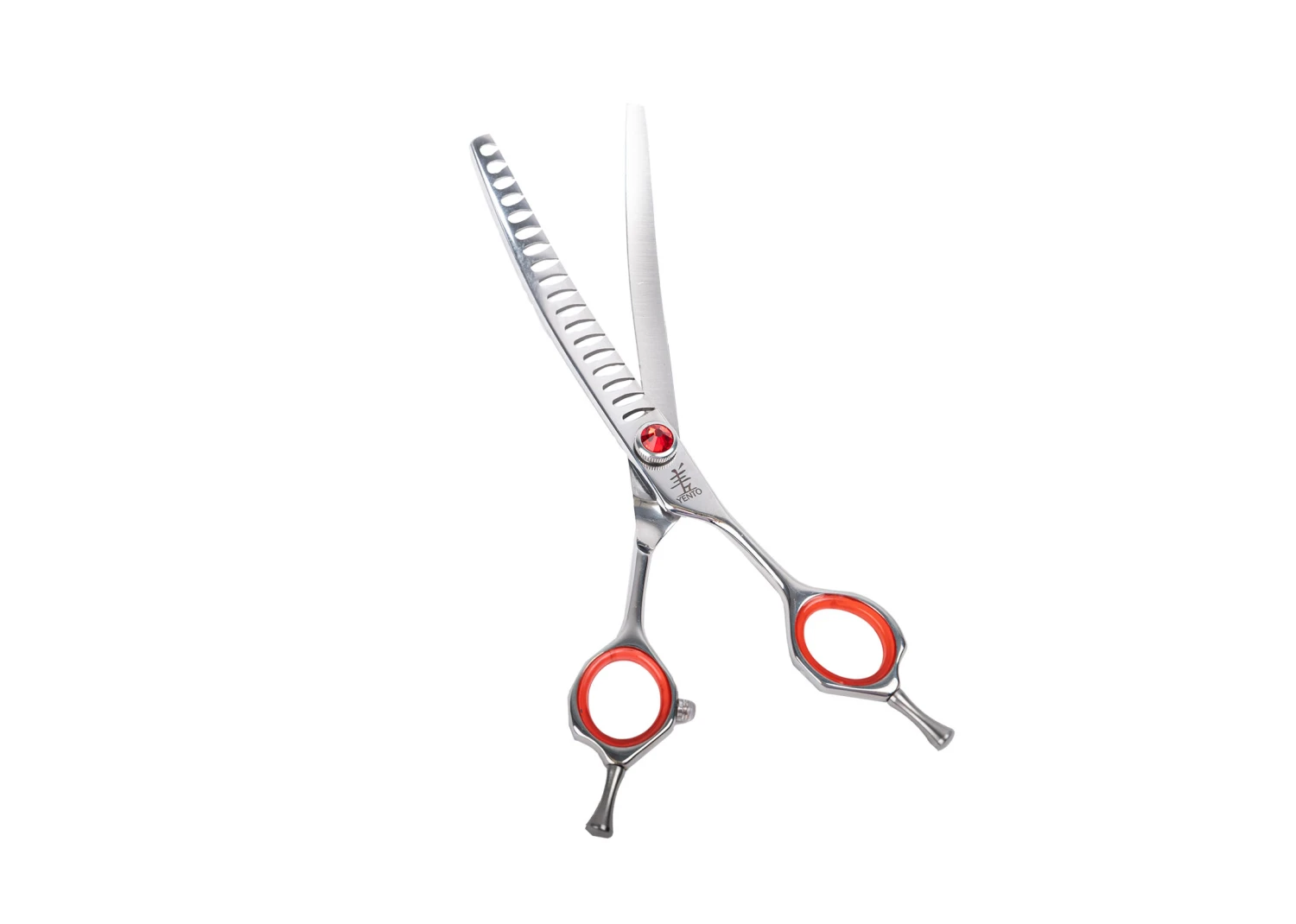 Presenting the ultimate grooming scissor for dog groomers – the Yento Prime Curved Chunker! Crafted with precision and care, these scissors have been specifically designed to make grooming easier, more efficient, and more comfortable for both you and your furry clients.